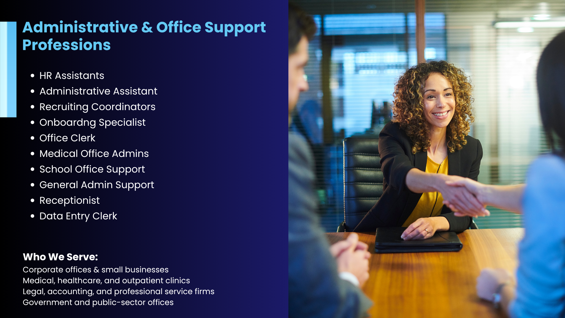 ✔ Opportunities in administrative, office support, food service, and light janitorial roles